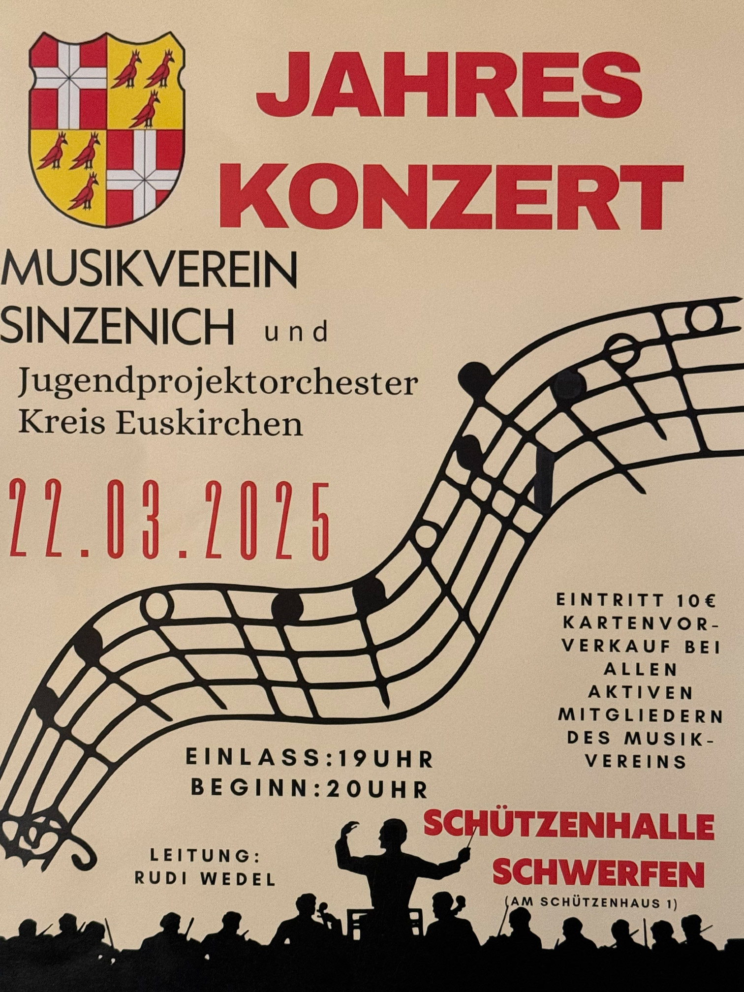 Nach einer längeren Planungs- und Werbephase startete zudem, unter der Trägerschaft des MV Sinzenich, mit der Probe am 14.02.2025, erfolgreich das Unternehmen „Jugendprojektorchester“. Am ersten Probeabend konnte die Dirigentin bereits 25 junge Musiker und Musikerinnen aus dem gesamten Kreisgebiet begrüßen, die sich im Domizil des Musikverein Sinzenich eingefunden hatten. Zwischen 9 und 22 Jahren bewegt sich die überwiegende Altersstruktur der Teilnehmer, die sogleich mit Feuereifer dabei waren. Geprobt wird zunächst für den Premierenauftritt beim Jahreskonzert des Musikverein Sinzenich, in dessen Musikheim auch die Proben stattfinden. In der Schwerfener Schützenhalle sollen dann am 22. März die neu eingeprobten Werke erstmals einem breiten Publikum vorgestellt werden.